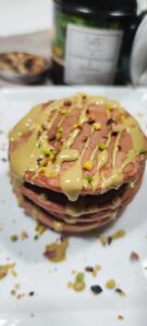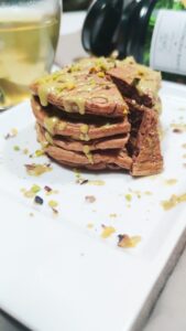 Quando i pancake saranno pronti li farciamo con la crema di pistacchio e con un po’ di granella.