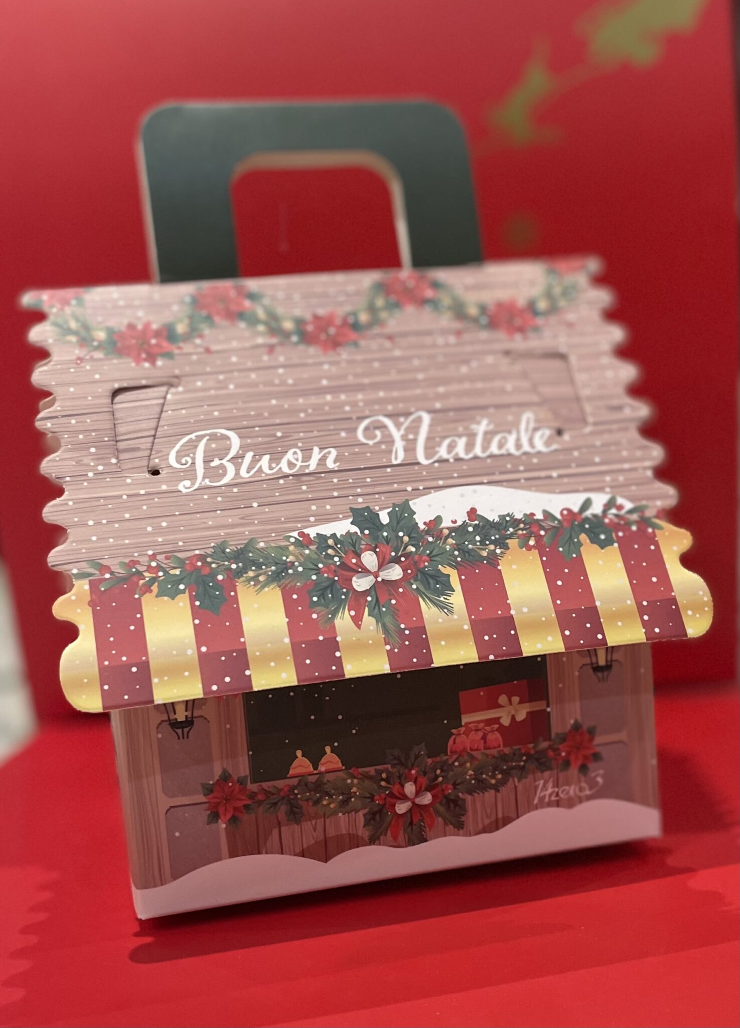 Scatola in carta a forma di casetta tema natalizio con all’interno tisana da 100g gusti assortiti